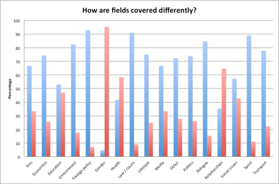 - The only fields in which women wrote more than 50 per cent of published pieces were relationships/parenting and specifically gender focussed articles. Twenty-one pieces (6 per cent of total) were focussed on gender, 20 of which were written by women.