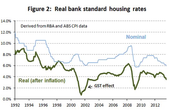 That happens to be around the real rate borrowers have been paying on home loans over the last 15 years, as illustrated in the graphs below – first the nominal home loan rate as reported by the Reserve Bank and second the real rate, with the inflationary effect removed.