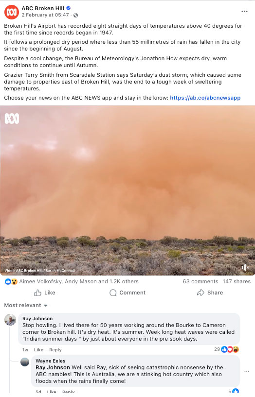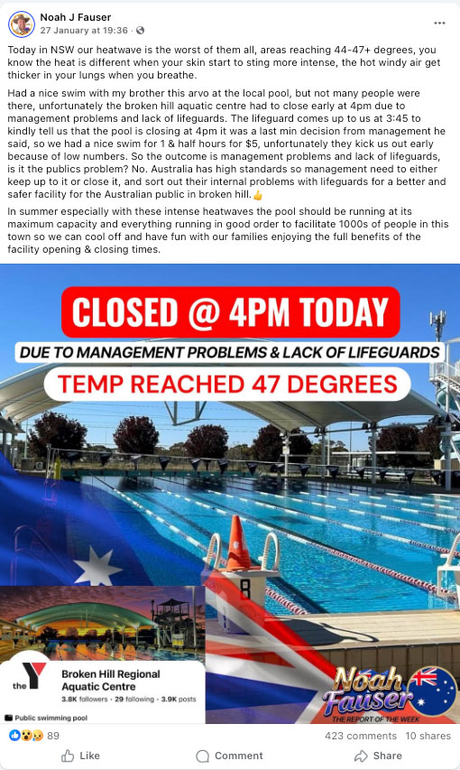 Heat can sometimes make humans do silly things. Take, for example, this social media rant posted last week on a Facebook page called Broken Hill Group by a gentleman unironically named “Noah”.