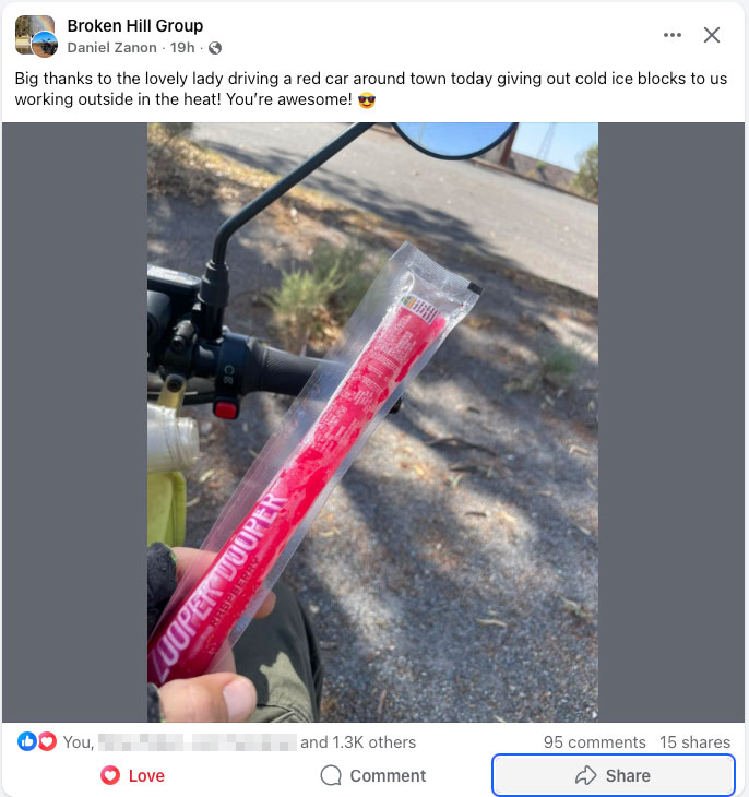So, notwithstanding Noah’s outrage at the pool staff shutting up shop early, here’s another post shared on social media last week: a story about a local woman who wandered around Broken Hill handing out Zooper Doopers to people unlucky enough to be working in the heat.