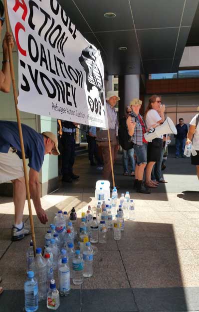 Refugee advocates and supporters have marched on Department of Immigration offices in Sydney, leaving water bottles at the building's entrance to protest the ongoing treatment of asylum seekers hunger striking on Manus Island.
