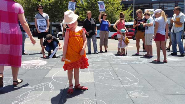 As the rally crossed away from Sydney’s Central Station towards George Street, attendees drew messages of support for asylum seekers on the footpath.